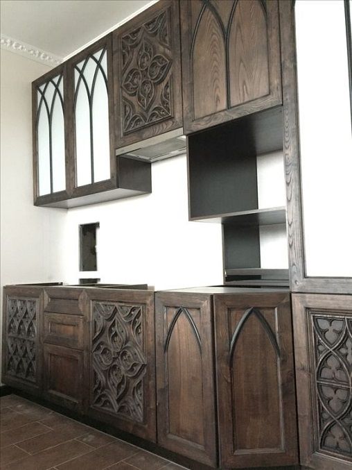 When your house has distinct Elizabethan, Gothic or (Mock)Tudor details, it’s a great opportunity to bring those carved flourishes into your kitchen design. Tudor-style kitchens often have refectory tables in the middle (where space allows) as a central focal point, and cabinets with carved detail that are befitting of the property.